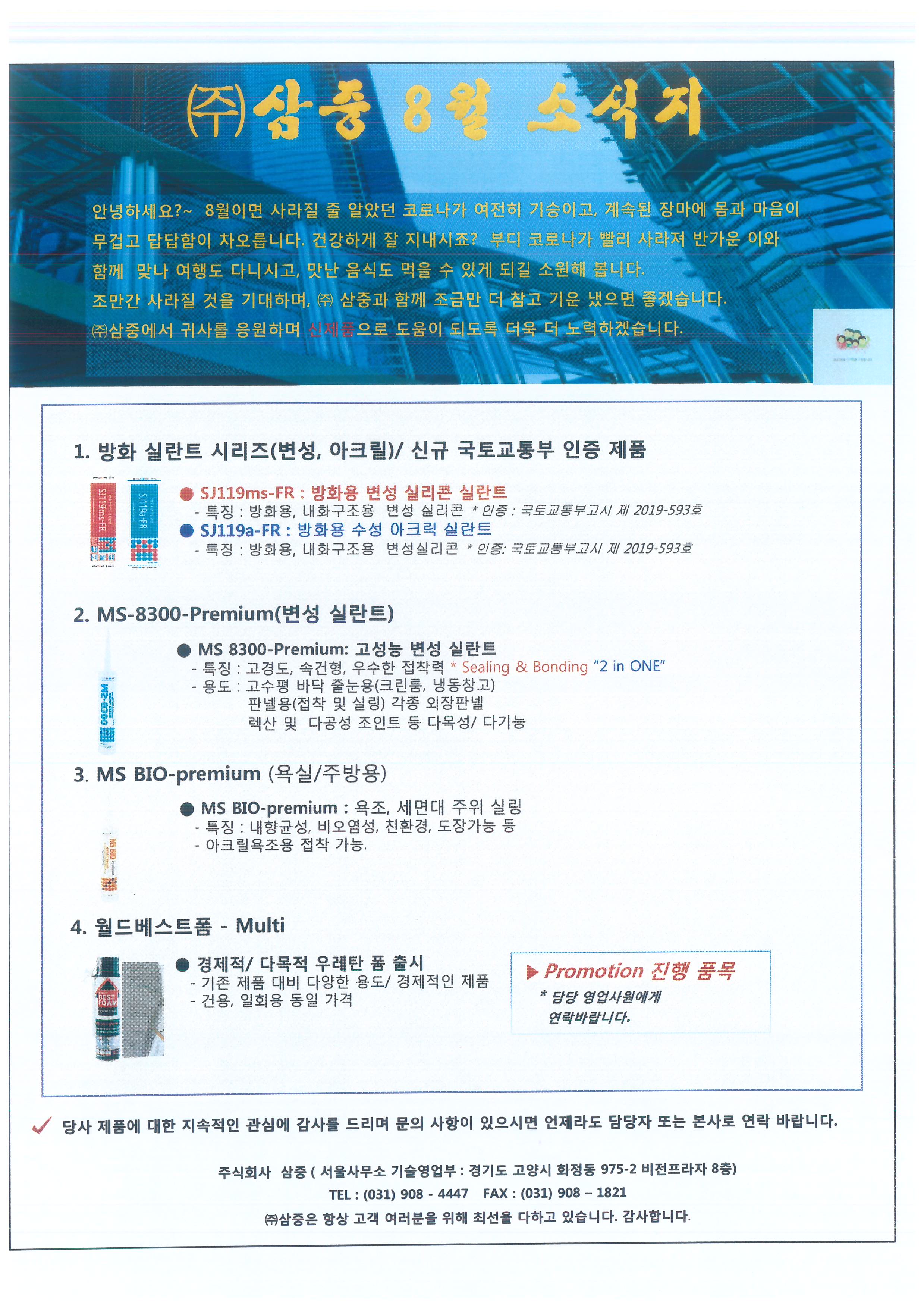 삼중소식지 삼중 방화용실란트 (변성,아크릴) 신제품 관련 페이지 정보 작성자 최고관리자 댓글 0건 조회 5,430회 작성일 20-08-07 16:22 본문 목록 이전글삼중 소식지 21.07.09 다음글삼중 동절기 고체(겔 및 고체타입) "Best Gel" 출시 19.11.11